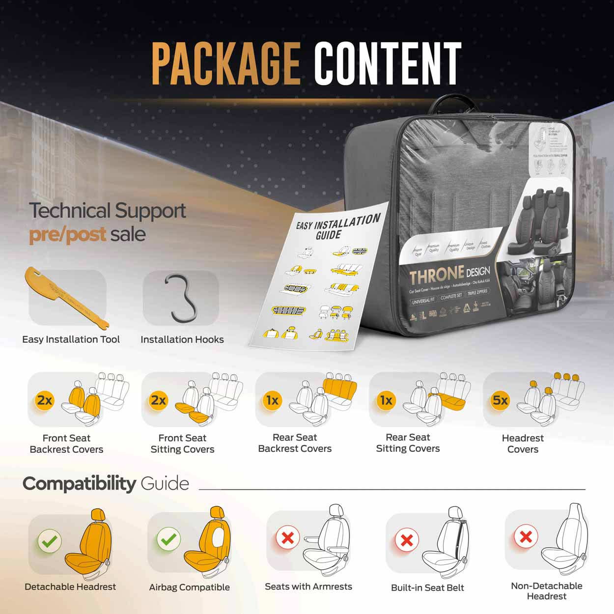 Pokrowce posiadają zamki w tylnej kanapie, dzięki czemu pasują do większości siedzeń dostępnych na rynku, (kanap niedzielonych, dzielonych prawo jak i lewostronnie). Możemy bez problemu złożyć oparcia, aby zwiększyć przestrzeń bagażową.