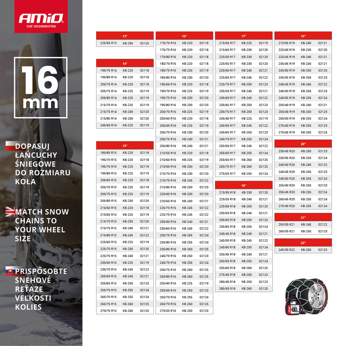 Łańcuchy śniegowe 16 mm 4x4 KB-225 AMIO-02119