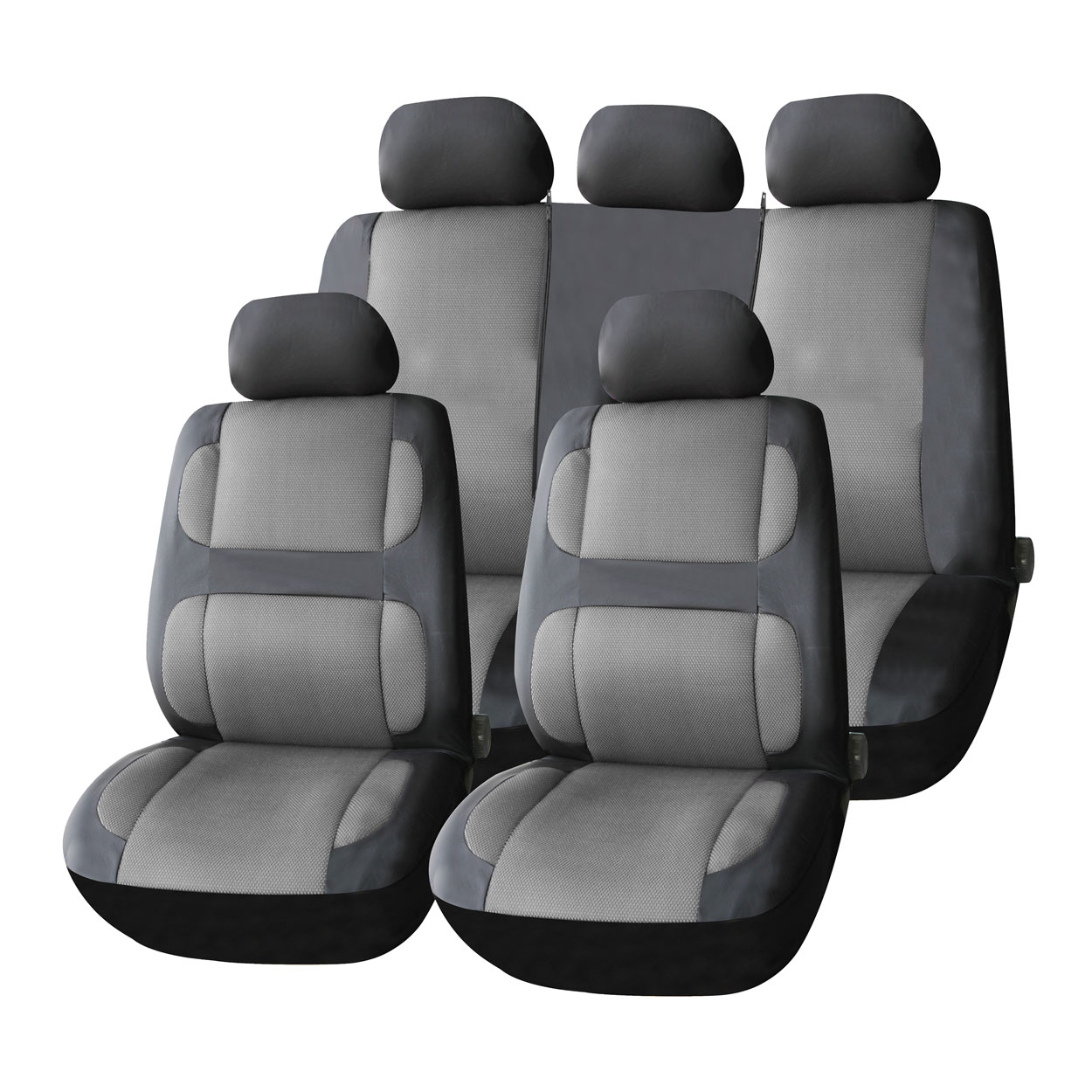 Zestaw 9-częściowy obejmuje pokrowce na dwa fotele przednie, tylną kanapę dzieloną oraz komplet zagłówków. Uniwersalne dopasowanie do większości modeli samochodów osobowych.