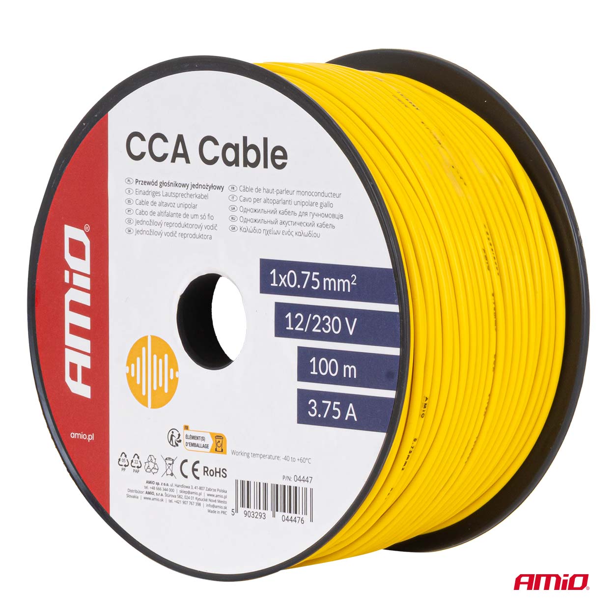 Przewód jednożyłowy żółty CCA 1x0.75mm2 100m 3.75A 12/230V AMIO-04447