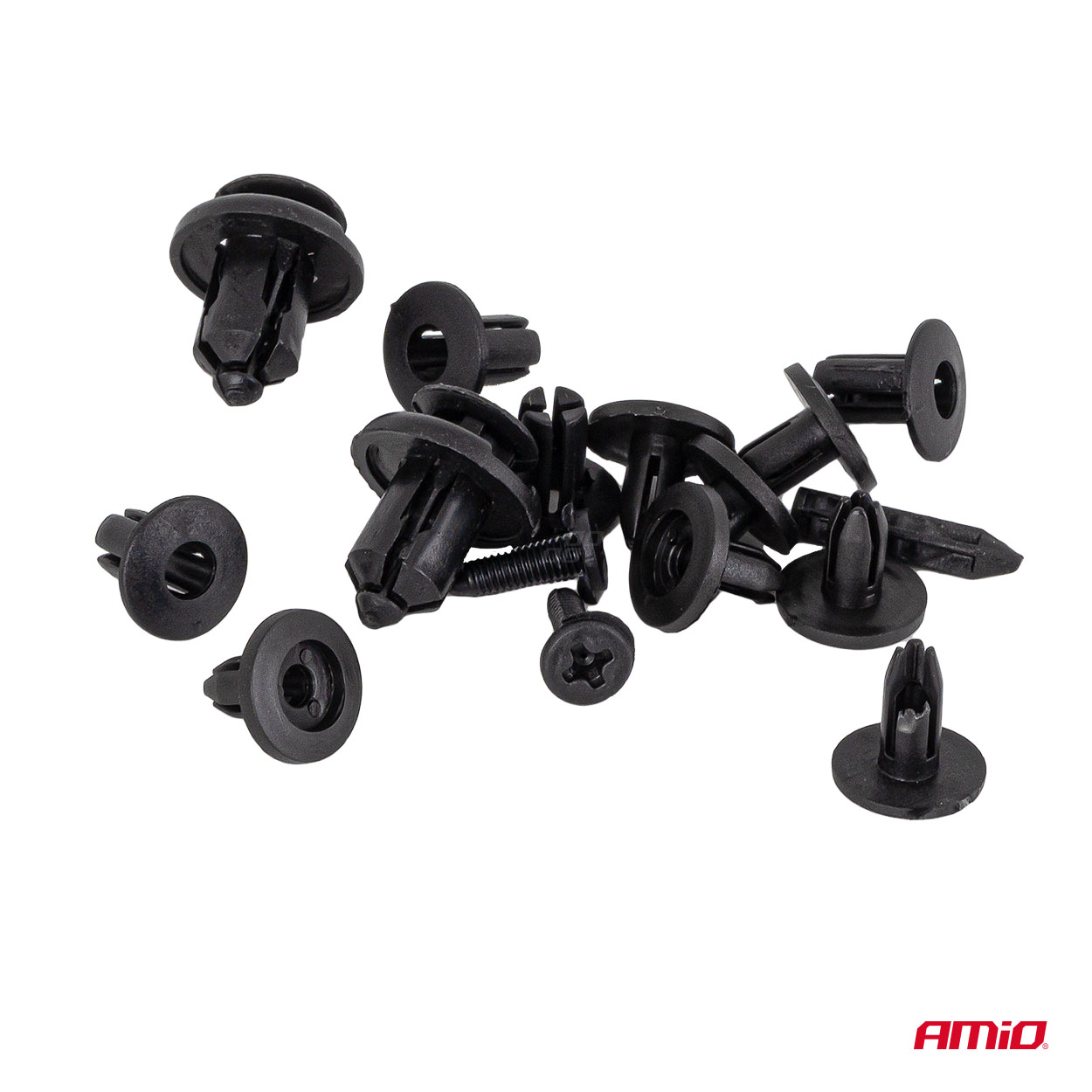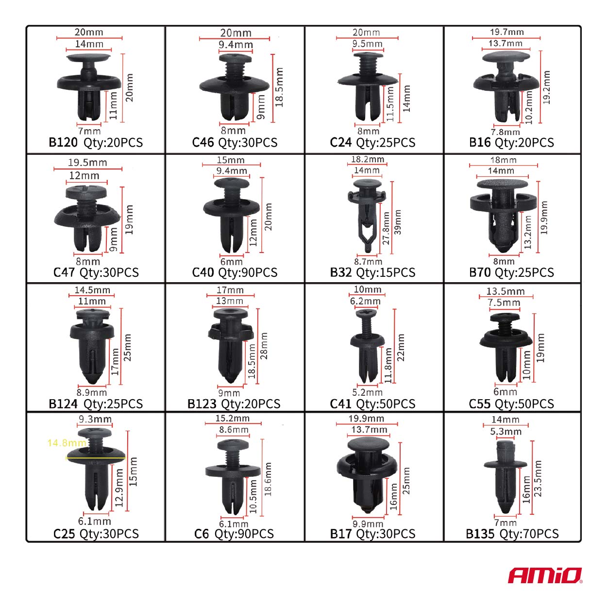Zestaw uniwersalnych elementów mocujących, klipsów, kołków wraz z narzędziami do ich demontażu łącznie 650 elementów. Wykonane z wysokiej jakości tworzywa PVC, zapewniają trwałość i odporność na uszkodzenia.