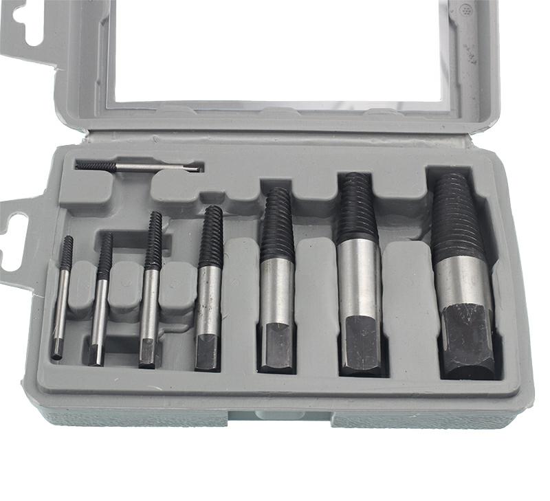 Zestaw 8 wykrętaków o różnych rozmiarach przeznaczonych do wykręcania zerwanych bądź uszkodzonych w inny sposób śrub, szpilek itp