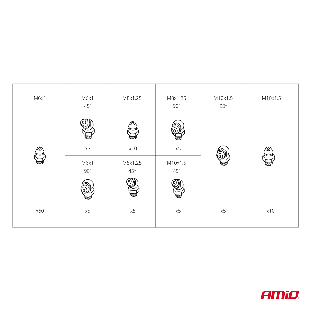 Zestaw zawiera smarowniczki proste , pod kątem 45 stopni i 90 stopni z gwintem M6, M8, i M10.