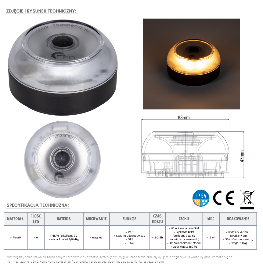 | Dodatkowe informacje | światło awaryjne, GPS, łączność z systemem DGT, na magnes |