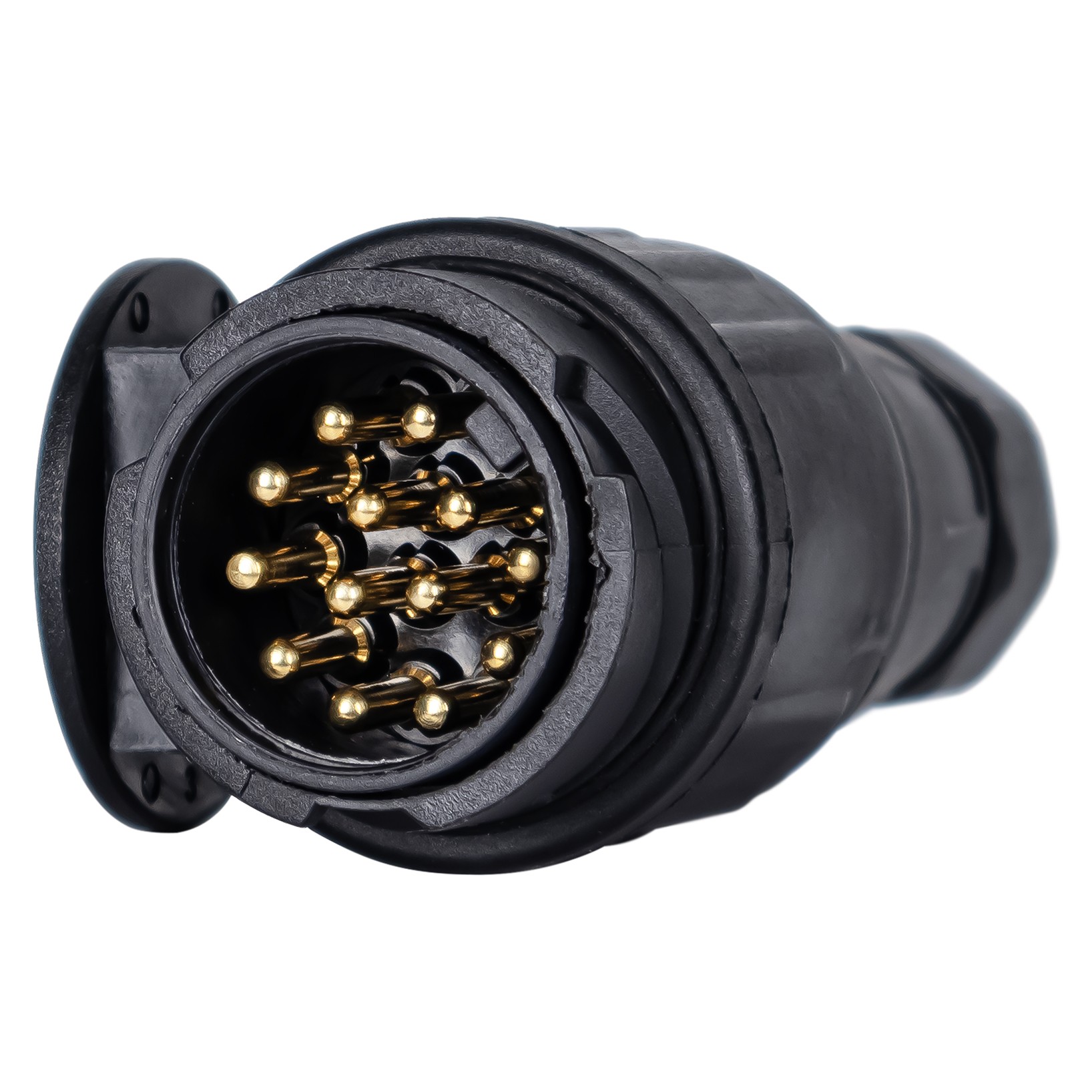 Wtyczka 13-pin to europejski standard połączenia elektrycznego, który zapewnia znacznie szerszą funkcjonalność w porównaniu do starszych wtyczek 7-pinowych. Jest to niezbędny element do prawidłowego działania wszystkich świateł oraz dodatkowych obwodów w nowoczesnych naczepach i przyczepach kempingowych (np. zasilanie wewnętrzne, ładowanie akumulatora).